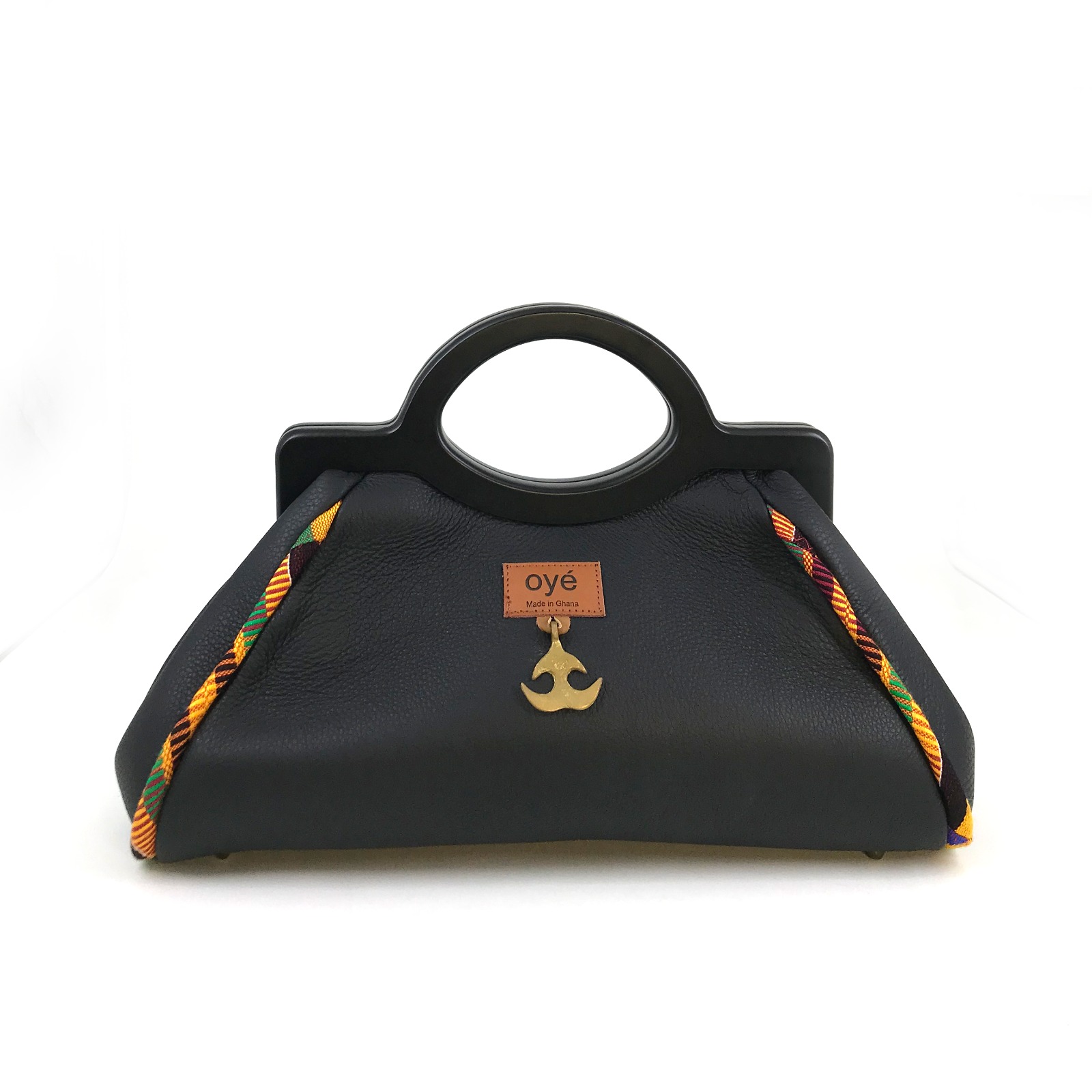 This purse is made from leather, wooden handle and an adinkra pendant that hangs in the front of the bag. Adinkra are symbols that represent concepts or aphorisms. Adinkra are used extensively in fabrics and pottery among the Ashantis of Ashanti Kingdom from Ghana.