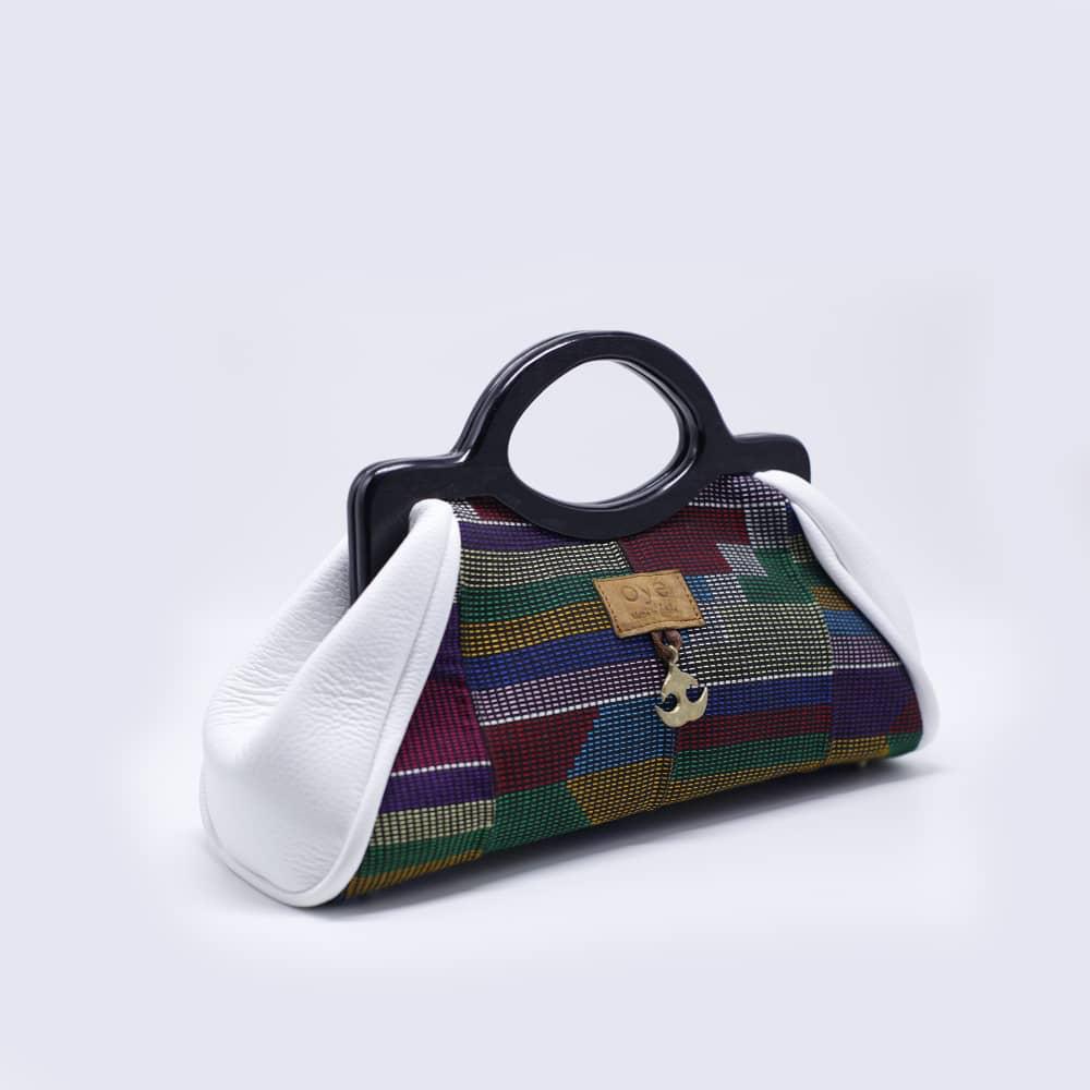 This bag is made from handwoven Kente fabrics woven in the Volta Region of Ghana, a wooden handle with leather on the sides.