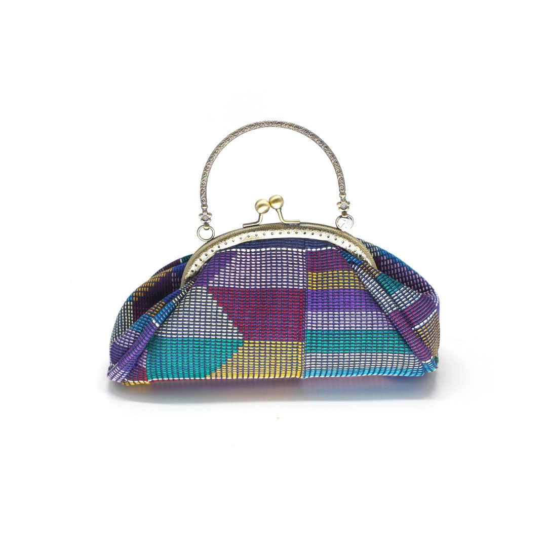 Obaa gets its name from its beautiful curves that give it a very feminine look. Obaa in twi (Local Ghanaian Dialect) means female. The pouch is made from colourful kente fabric with a bronze tone kiss clasp handle. The pouch has a base of 10 inches, width of 3 inches and a height of 5inches. This bag is made from handwoven kente fabrics woven in the Ashanti Region and the Volta Region of Ghana, a bronze frame.